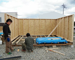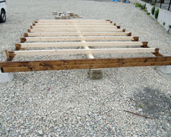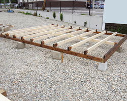 建築場所を決めましたら、 土台部分を作成します。 場所や季節の天候などを 考慮しながら高さを上げる、あるいは平らに設置します!また、ガレージ作成の場合、コンクリート土間を作ります。※床・基礎はキットには含まれておりません。 |